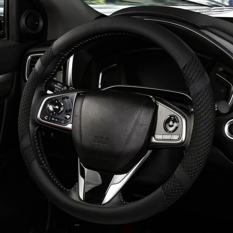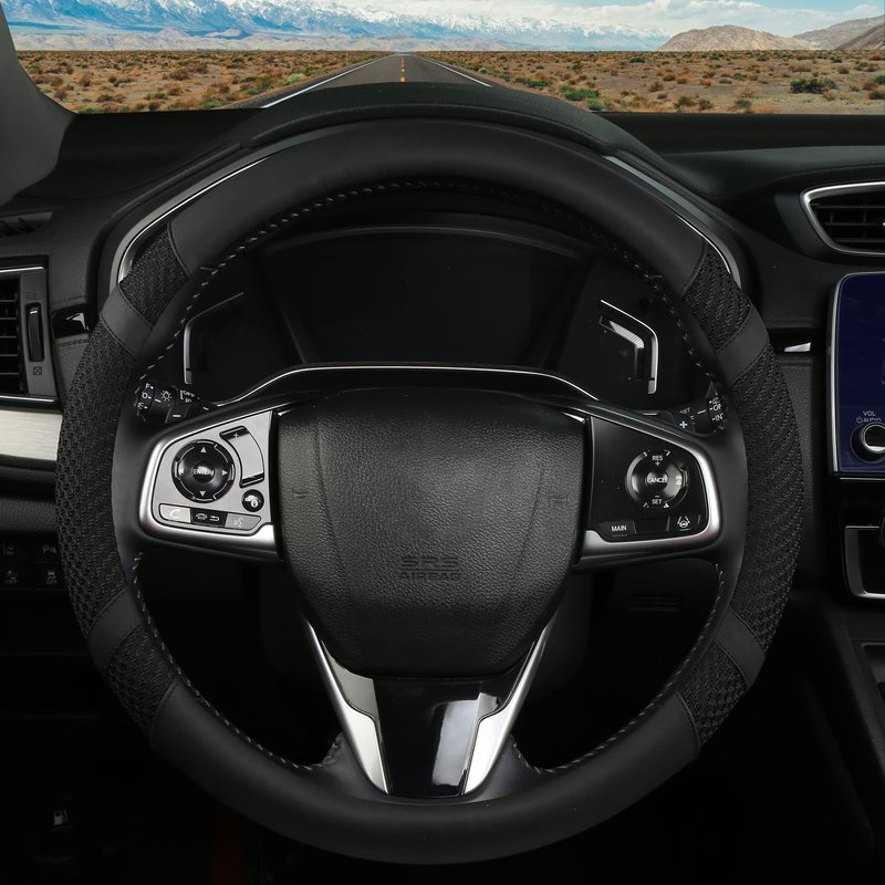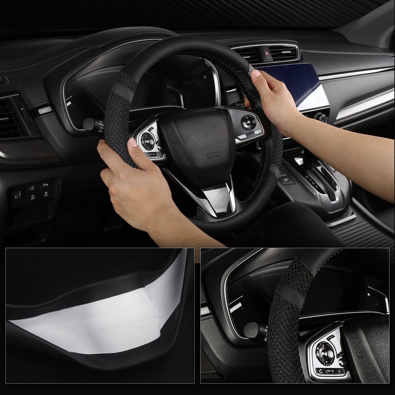 - 【Exterior leather and ice silk material smooth and breathable】The exterior of this car steering wheel cover is made of wear-resistant PU leather, which is stylish and beautiful, giving you an excellent touch and comfortable experience; the ice silk mesh design on both sides, No sultry feeling and quick to absorb sweat, warm in winter and summer cold.