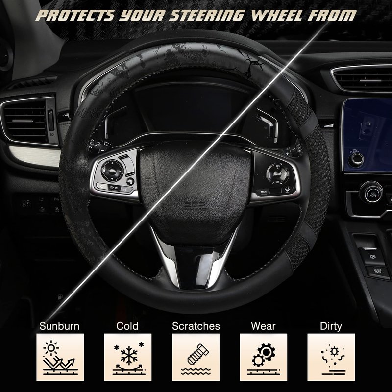 - 【Beautify and protect your car steering wheel】Microfiber leather and viscose fiber use exquisite sewing technology to decorate and protect your steering wheel to prevent further wear. Black steering wheel covers is our recommended color, classic and versatile, giving your car a sense of luxury.