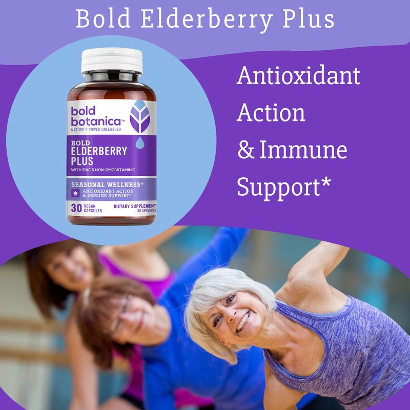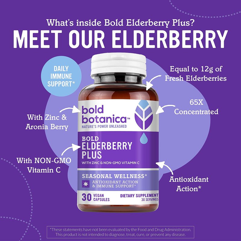 Bold Botanica Elderberry Plus - 65x Concentrated Black Elderberry Extract with Zinc & Vitamin C for Daily Immune Support & Seasonal Wellness - Non-GMO, 30 Vegan Capsules