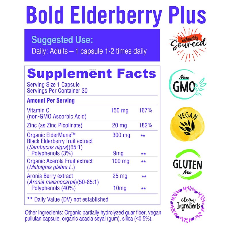 Bold Botanica’s Bold Elderberry plus features a 65 X concentrated elderberry extract produced using a patented, state-of-the-art, low heat drying process. This innovative, solvent-free process allows more complete and bold preservation of the elderberry’s unique spectrum of naturally occurring beneficial compounds. Bold Elderberry Plus contains standardized levels of beneficial polyphenols and packs an antioxidant punch with each capsule delivering the equivalent of 12.67 grams (12,670 mg) of fresh elderberries. We amplify the formula with Non-GMO Vitamin C, Zinc picolinate (a more bio-available form of Zinc), organic Acerola extract, and a potent extract of polyphenol super-star Aronia berry – all the good stuff in one capsule: polyphenols, anthocyanins, flavonoids, Zinc, and Vitamin C