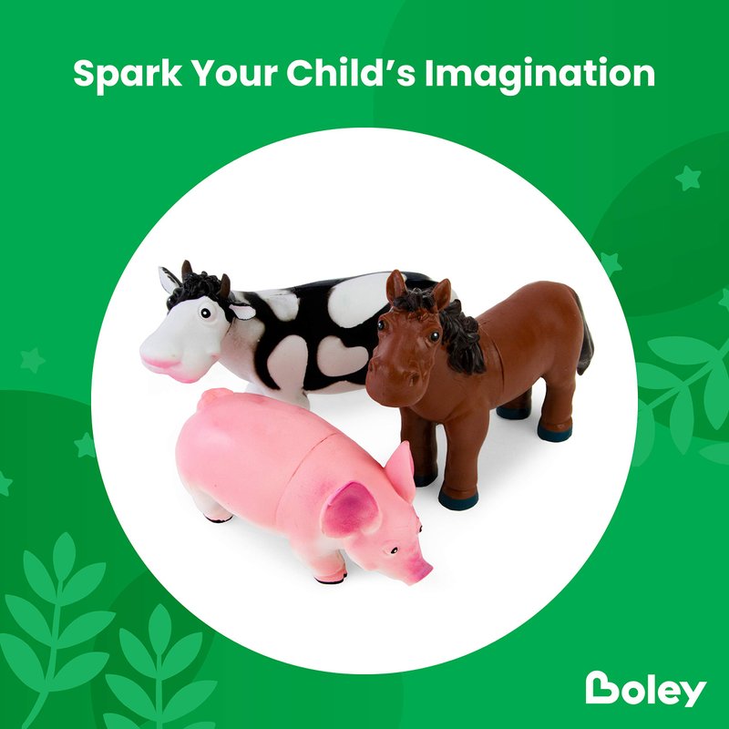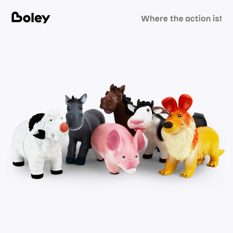 - WHAT'S INSIDE: Meet the newest members of Boley's farm animal collection! There's a cow, pig, horse, donkey, sheep dog, and a ram, all with a cartoony design in bright yet realistic colors. For ages 3 ad up.