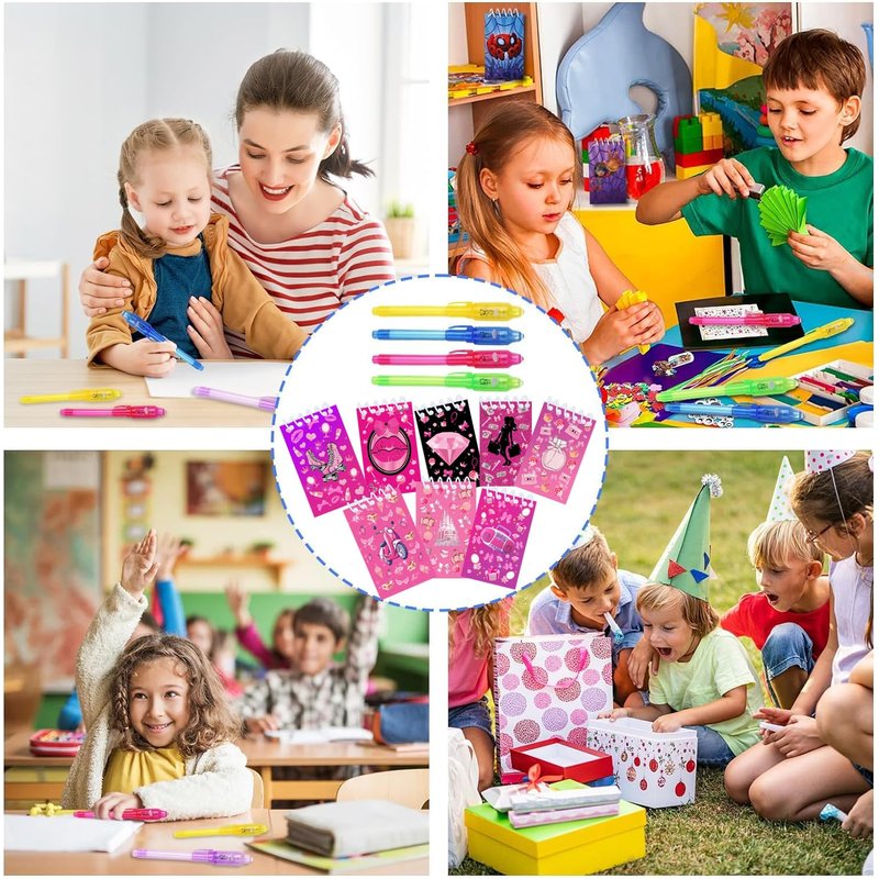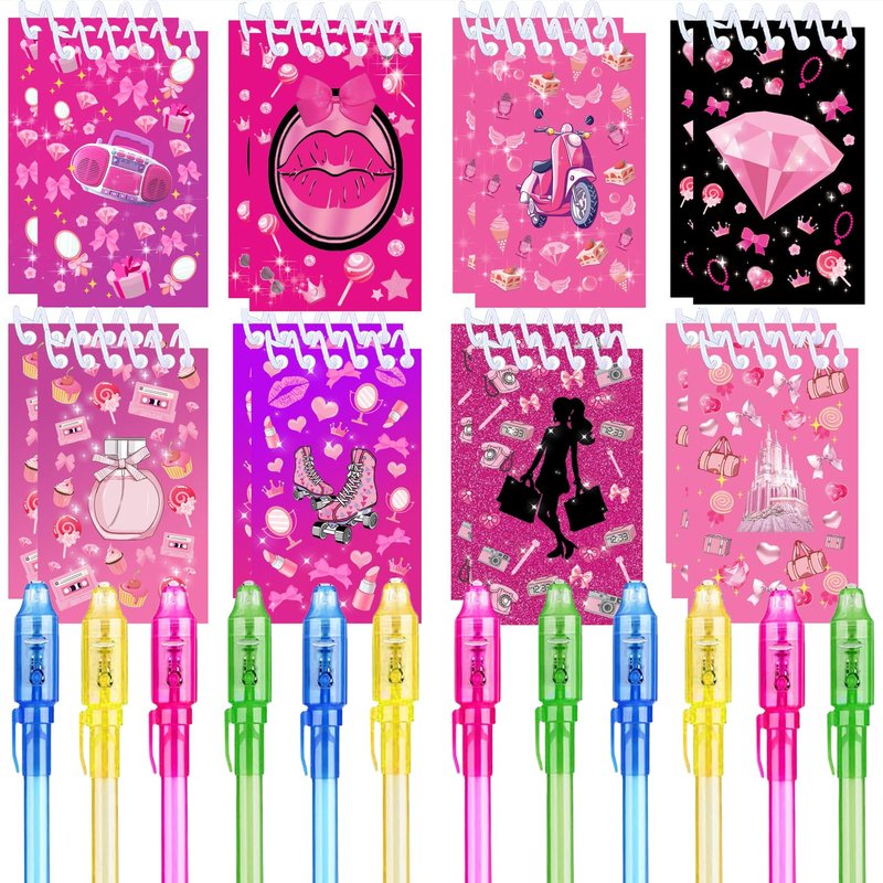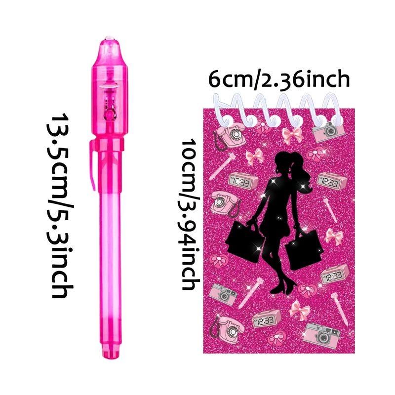 - Includes 12 invisible ink pen with uv light + 12 Pink Girl mini notepads(2.4-inch x 4 inch)