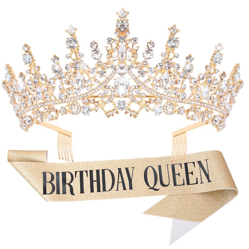 - ♕ ENCHANTING CROWN: A gold crown adds a touch of sparkle to your birthday party dress. The crown is encrusted with beautiful rhinestones that sparkle, and with the unique gold glitter BIRTHDYA QUEEN sash, you are our queen!
