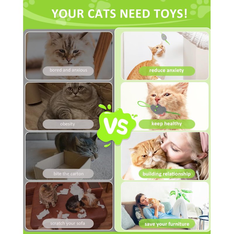 - 【3 Random Motions for Indoor Cat】This automatic cat toy is powered by a smart motorized system, which features bouncing, wiggling, and shaking the mice that stimulate the cat's natural instincts to chase, pounce, and play to keep your fur babies healthy. With just one toy, you can create an irresistible lure for your cat and simply let your cat fall in love with it, and stop cats getting bored and anxious when you are away.