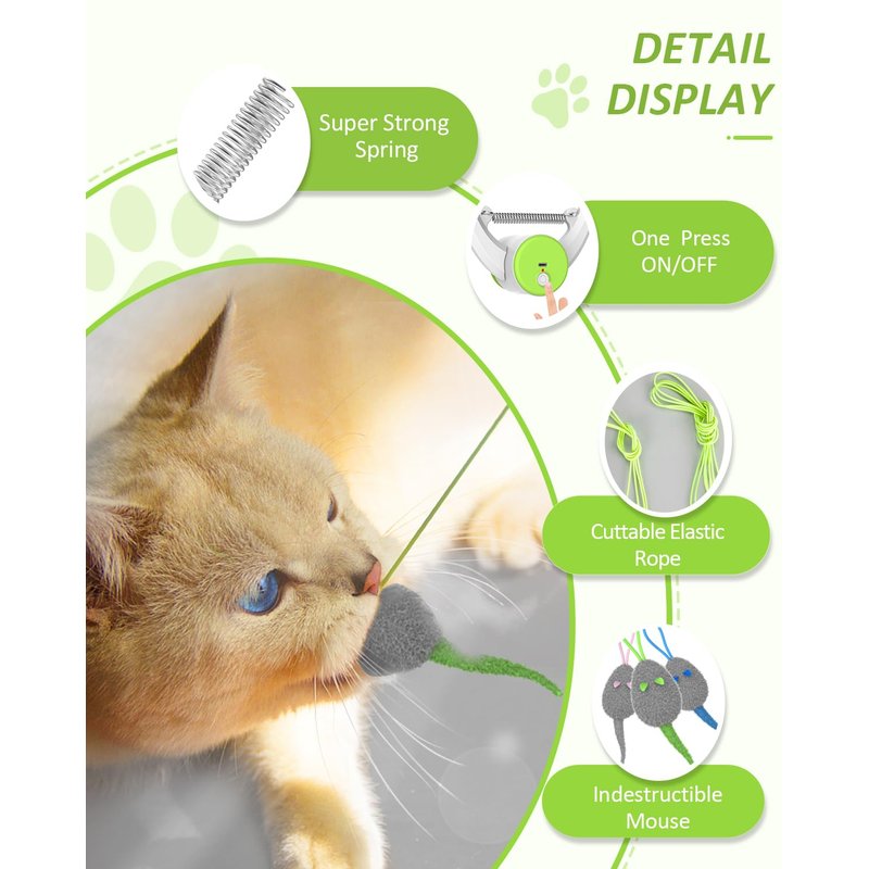 - 【One Click to Start Smart Accompany】😻1▶Automatic running for 15 minutes after pressing the button. 😻2▶it will stop playing after 15 minutes, it’s on standby for 15 minutes and then restart again. 😻3▶Playing for 15 minutes after reactivation will automatically turn off and hang the mice at its lowest point allowing your cat get rest after active exercise and watch the mice as it wiggles and flies around when your cat touches it even after the kitten toys is paused.