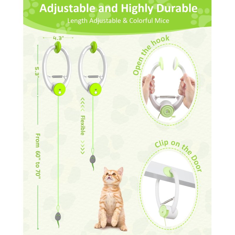 - 【Adjustable and Highly Durable】Our interactive cat toy is equipped with 2 different length ropes and 3 colorful feather mice which are made of thick, abrasion-resistant,100% non-toxic, and safe material, The longest rope can be stretched to 78''(2m) and be cut at will according to individual needs which have high toughness and tensile strength and will not be scratched or bitten by cats.