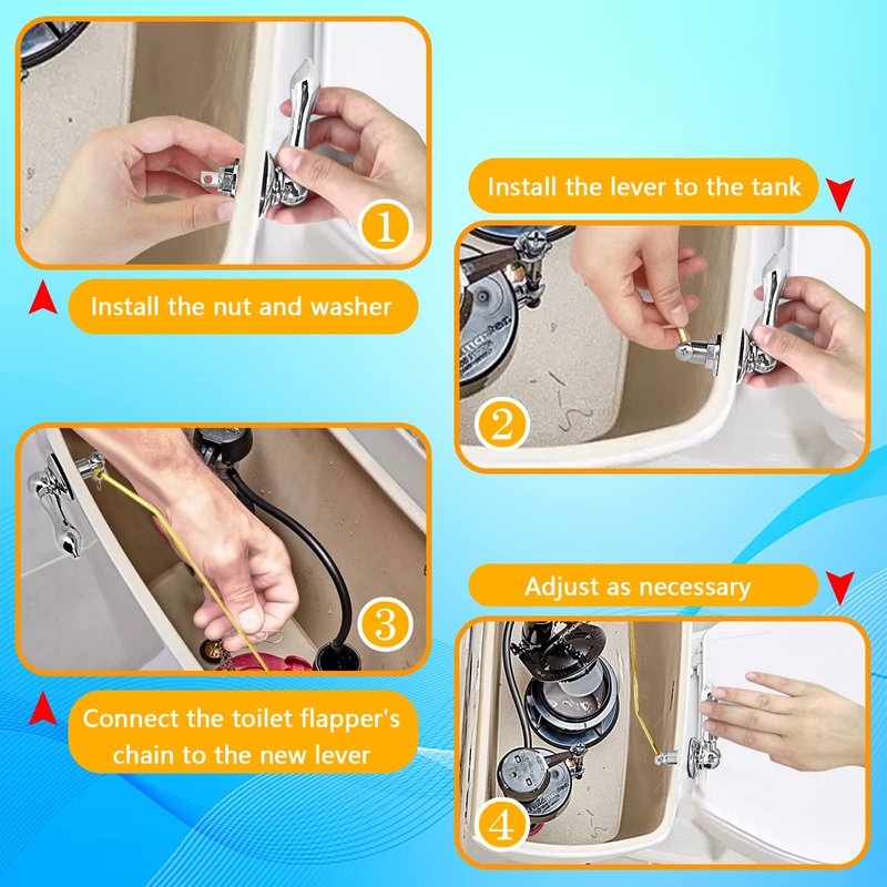 Universal Front Angle Mount Toilet Handle, Chrome Finish Toilet Tank Flush Handle Lever, Toilet Trip lever Handle Replacement Kit with 1pc Stainless Steel Flapper Chain Features: Replace your broken tank lever with good quality, chrome finish upgrade Trims/bends to fit most front and angle-mount tanks Easy to install, Universal design Durable brass arm tightening metal locknut won’t easy to loosen over time Instructions: 1. Remove chain or strap from existing flush lever 2. Remove old flush lever 3. Insert new flush lever into toilet 4. Attach locknut to flush lever and tighten it down to toilet tank, Note: the threads tighten in the opposite direction. Do not over tighten 5. Attach chain or strap of toilet flapper ball to new flush lever and adjust as needed. Note: a free stainless steel chain is included in package