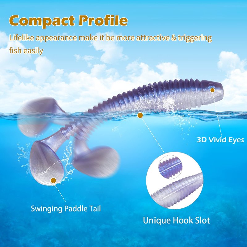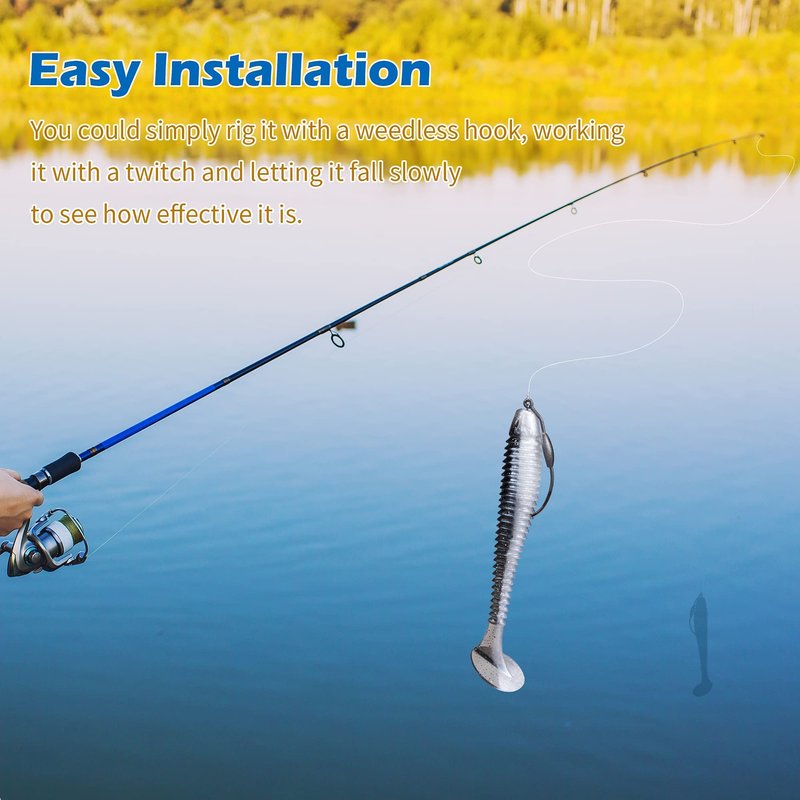 - 【PADDLE TAIL】The amazing part of it is the tail, it provide the swimbaits with free swinging action & triggering fish to bite as it wiggles with the slightest tug of the rod or retrieve .Colorful glitters infused making them be more attractive.
