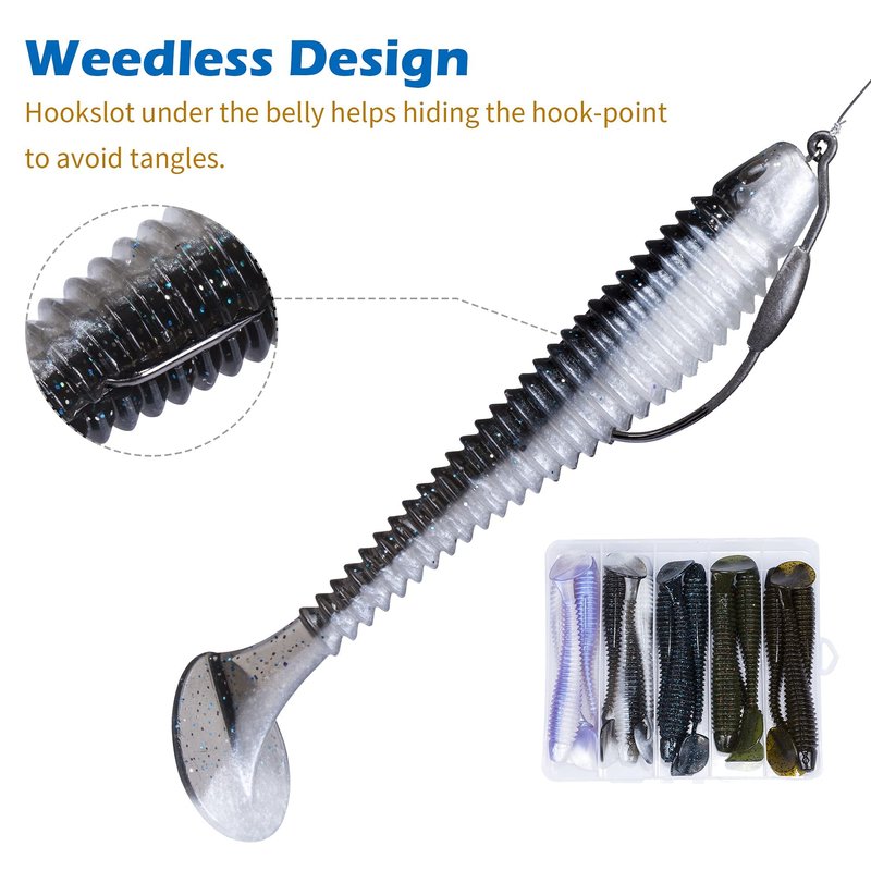 - 【WEEDLESS】Unique hookslot design under the belly for easier rigging, better penetration & helps to hide the hook-point to avoid get tangle with the weeds. Equipped with unique head for a seamless fit with bullet weights & jig head.