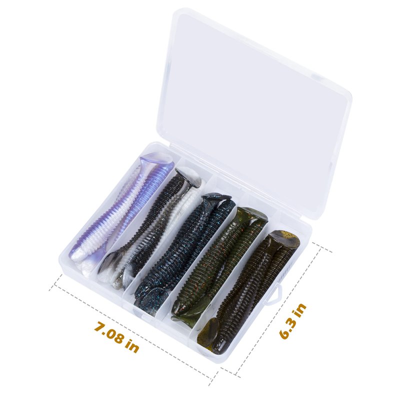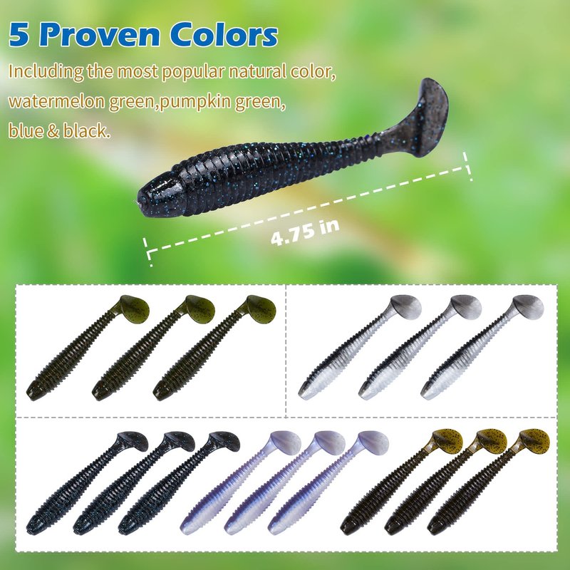 - 【VERSATILE SWIMBAIT】Easy & quick to use. Comes in 5 proven colors,including the most popular natural color: watermelon/pumpkin green,blue & black. You could either rig them with jig head or just rig with a weedless hook without weight.They work very well on chatterbait, jighead,weedless hook,etc. Suitable for fish like: bass, perch, panfish, pike, walleye, musky, trout, etc.