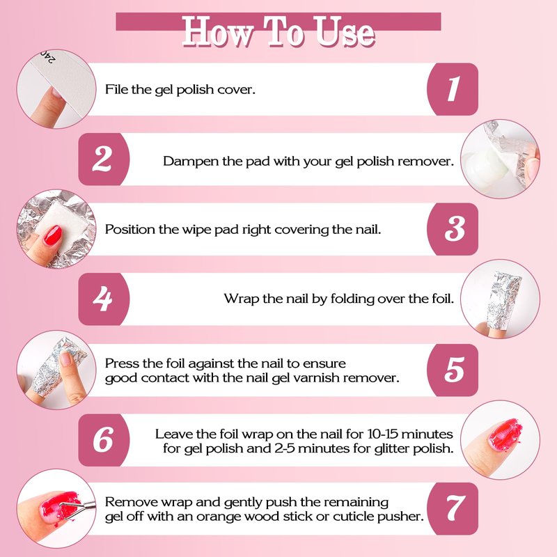 - 【Easy to Use】Just put some pure acetone on the nail polish remover pad and wrap it around fingers or toe nails, wait 5-15 minutes then the gel polish come right off, without any scraping. Disposable wraps is easy to clean.