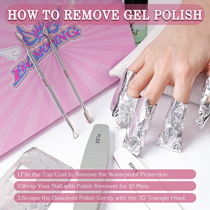 - 【5-in-1 Value Pack】BOMOQING gel nail remover kit contains 200 pieces of foil nail wraps, 2 nail files ,1 cuticle scraper and 1 pusher. Cost-effective nail removal kit, meet your nail removal needs at once. (Acetone Remover not included)