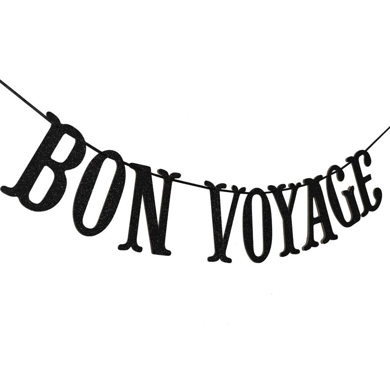 Bon Voyage Party Banner for Adventure Awaits Going Away Celebration Moving Away Retirement Party Decorations Sign Bunting (Black Glitter)