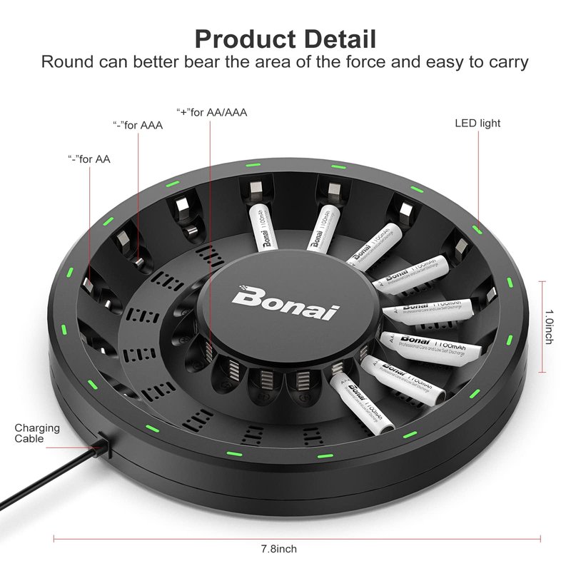 - Unrestrained Charging: This round-shape rechargeable batteries charger offers 16 different channels allowing you to charge AA/AAA NIMH/NICD rechargeable cells(batteries do not included).Individual charging for each slot, the number of batteries is up to you.