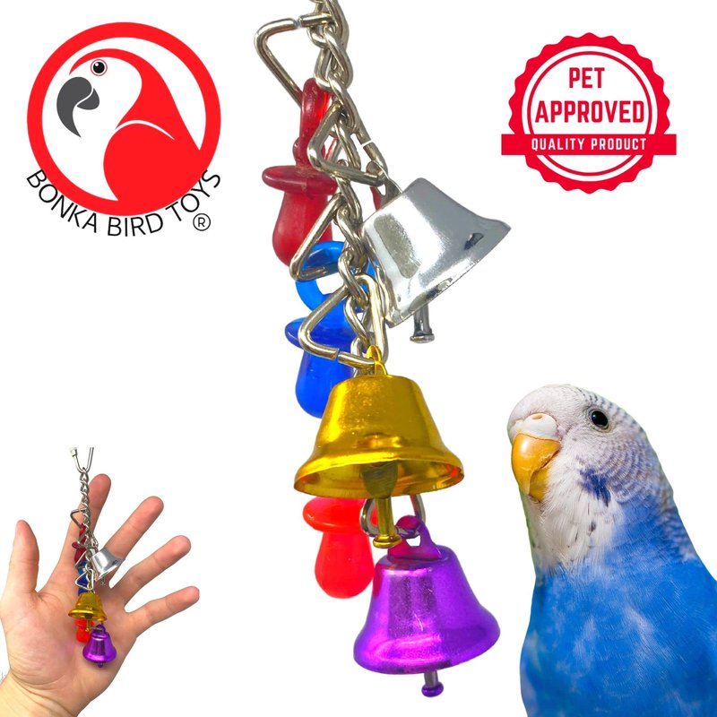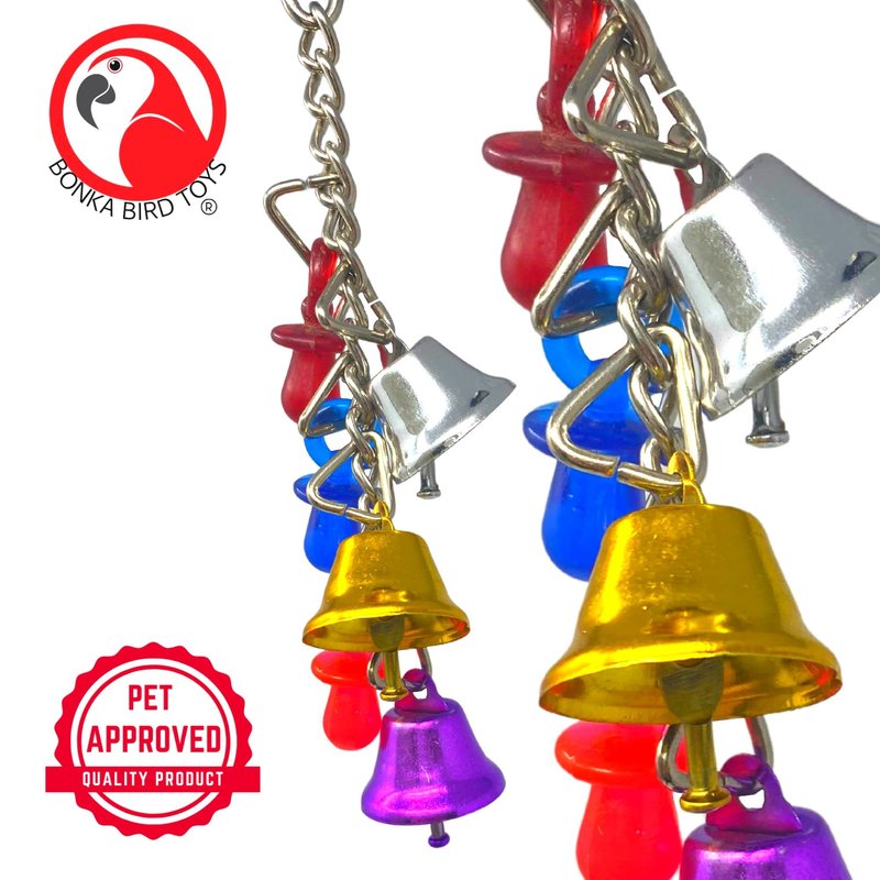 Bonka Bird Toys 1107 Jingle Bells Bird Toy provides pull and tug ringing fun and excitement to any birdcage. The toy features shiny ringing jingle bells and brightly colored acrylic pacifiers for your small feathered friend to enjoy. The toy is durable and long-lasting and will become a fixture in the cage for a long time. It measures approximately six (6) inches long by two (2) inches wide and has a quick link for easy cage placement.