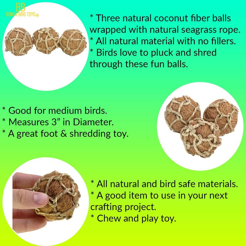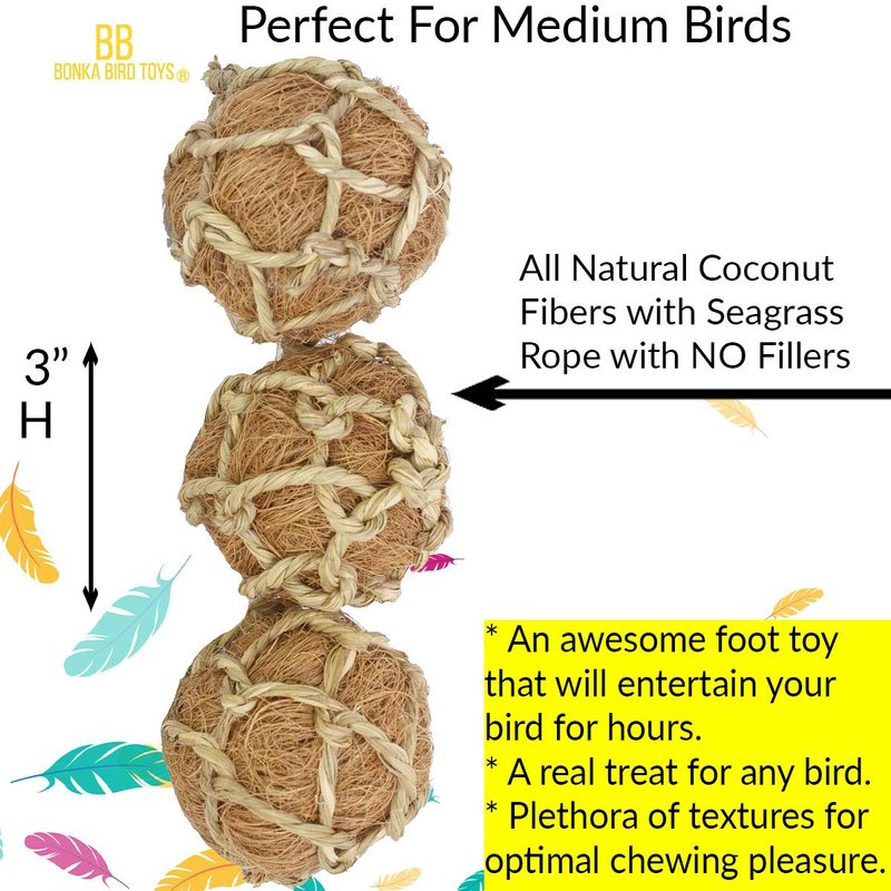 Bonka Bird Toys 1276 (Pk3) Coconut Fiber Balls 3", Parrot Foot Talon Chew Forage Cage Toy, Amazon, African Grey, Pionus, and Similar