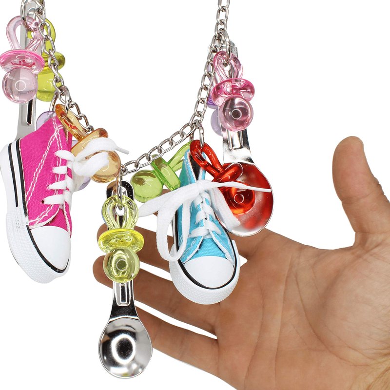 - Versatile Hanging Options: Equipped with easy-to-use quick link connectors at both ends this toy offers the flexibility to hang it anywhere in your pet's cage creating a dynamic play space tailored to their preferences.| Stimulating Textures and Colors: The core of this toy is a sturdy link chain adorned with an assortment of beak and feet pleasing items including: Colorful Translucent Acrylic Pacifiers: These pacifiers are not only a delight to chew on but also create a mesmerizing effect as they reflect light adding a visual spectacle to the tactile experience.| Shiny Stainless Steel Measuring Spoons: The reflective surface of these spoons offers a shiny enticing object for your bird to explore stimulating their curiosity and engagement.| Cotton Sneakers with Real Parts: Featuring laces a tongue and a soft rubber sole these sneakers provide a unique chewing and playing experience mimicking real-life objects in a bird-safe format.| 100% Bird Safe Materials: Safety is paramount and the 1340 Sneaker Delight is crafted from materials that are completely safe for your bird ensuring peace of mind during playtime.| Durable Construction: Designed to withstand the enthusiastic play of small to medium-sized birds this toy is both durable and long-lasting making it a cost-effective addition to your bird's toy collection.| Dimensions: Length: 11 inches Width: 4.75 inches Depth: 1.5 inches| Weight and Size: Perfectly sized for small to medium birds offering a substantial plaything without overwhelming smaller cages.