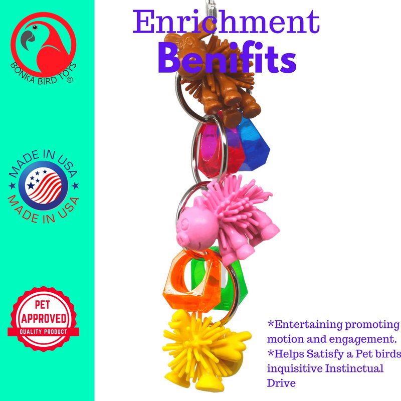 The 1716 Farm Ringer From Bonka Bird Toys is a colorful delight that your small to medium size pet will just love to climb, pull and chew!!!. Its simple but colorful design will help your feathered friend fine-tune his physical skills. 1716 Farm Ringer it's a large circular link chain adorned with bright colored fuzzy farms animal and colorful acrylic rings, comes with an easy quick link complete with hanging hardware. The 1716 Farm Ringer From Bonka Bird Toys is 100% Bird Safe, Weighs and measures approximately: Width: ( 2) inches Height: 9 inches Weight: (3) ounces