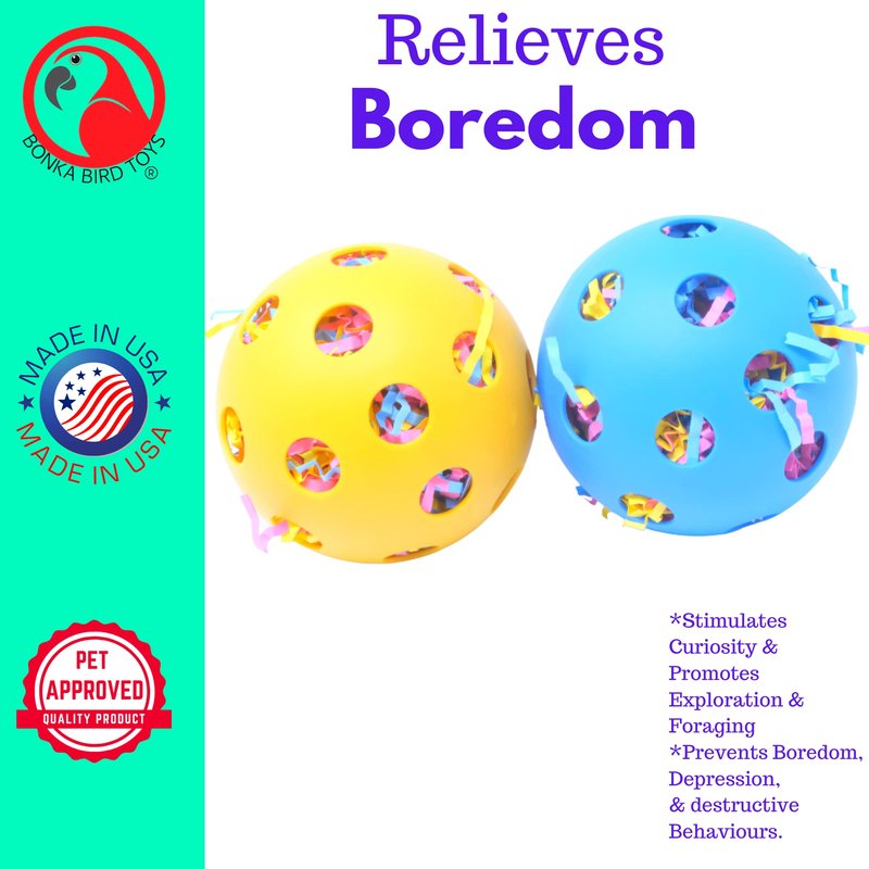 The 2404 Pk2 Huge Stuffed Balls from Bonka Bird Toys are classic foot toys that pet birds adore! These foot toys are brightly colored and filled with shreddable paper. The pack includes (2) foraging balls that each have a different bright color. The only difference from one ball to another is their color as they have all been designed the same. On the front and the back of each foraging ball, there are small round holes exposing the stuffed shreddy paper. Your pet will have a ball trying to pull out and grab the shreddy paper inside of the balls. The holes also provide places for your pet to grab onto the balls with their beak and feet. Each ball is very light and lets birds of all ages and abilities pick them up and throw them around their environment. The balls can also be used for art and craft projects with their cute designs and delightful colors. You can even use the holes on the balls to string them up around the cage and add them to other toys and objects. The 2404 Pk2 Huge Stuffed Balls are 100% bird safe shipped in bright assorted bird-pleasing colors and weigh and measure approximately: Diameter: (3.5) inches or (3 1/2) inches Single ball weight: Under (1.0) ounces