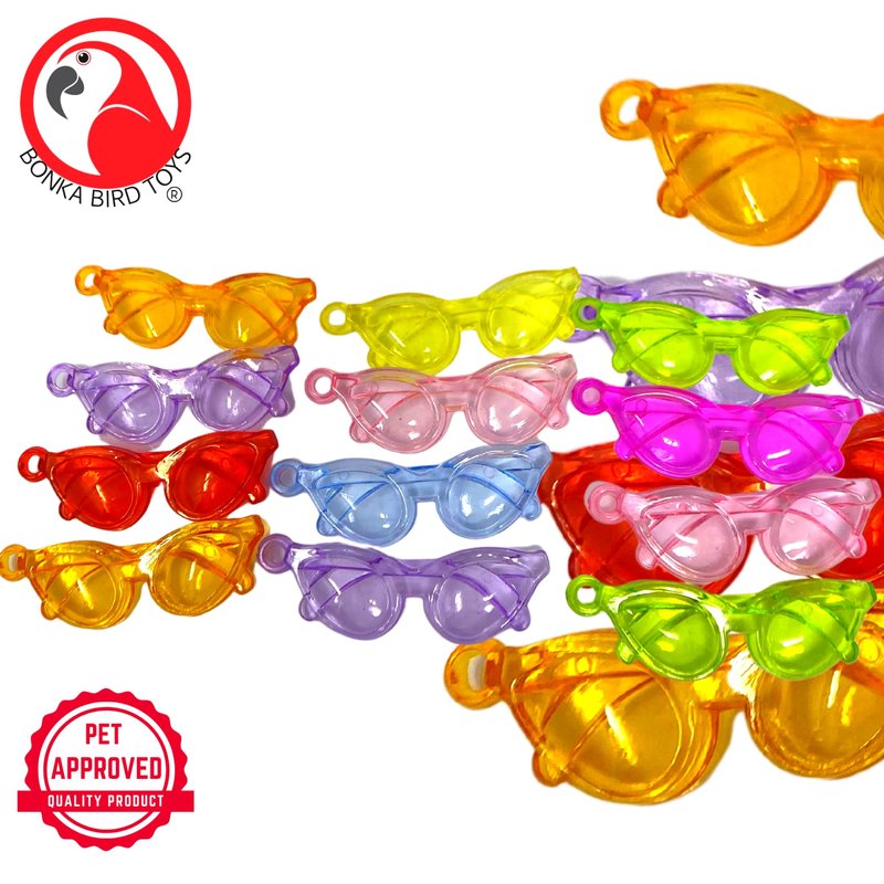 The 2525 Pk12 Color acrylic sunglass beads from Bonka Bird Toys are a superb and colorful toy part for your bird and DIY projects that you have in mind. These bright acrylic sunglass beads add an eye-catching and vibrant energy to any toy your creativity can come up with. This toy part is durable and long-lasting and could easily be used as a foot-talon bird toy, providing hours of entertainment for your feathered friends. They measure approximately 1 1/2 inches long, 3/4 inches wide, with a 1/8 inch hole.