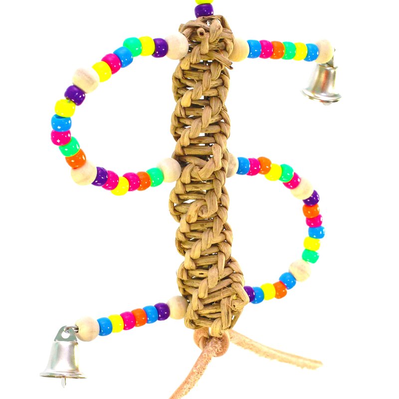 The 901 Swirl Shredder from Bonka Bird Toys is an irresistible colorful and fun toy that brightens up any birdcage. The top of this small bird toy has a small size quick link connector which lets you easily install it in your pet aviary. A metal wire loops around the connector and passes through the center of the toy keeping its shape. The top of the wire has colorful plastic beads that pet birds love to look at and play with. The middle of the toy is a natural vine ladder. This ladder is an ideal shredder material that your pet will love to chew apart. Passing from side to side is a colorful swirl of beads that have a metal bell hanging from either side. Your pet will also find natural wooden beads in between the colored plastic beads. The bottom of the small bird toy has a natural leather strip knotted and hanging. The 901 Swirl Shredder weighs under (3) ounces and measures about (10) inches tall, (6) inches wide and (2) inches deep. This small bird toy is 100% bird safe.