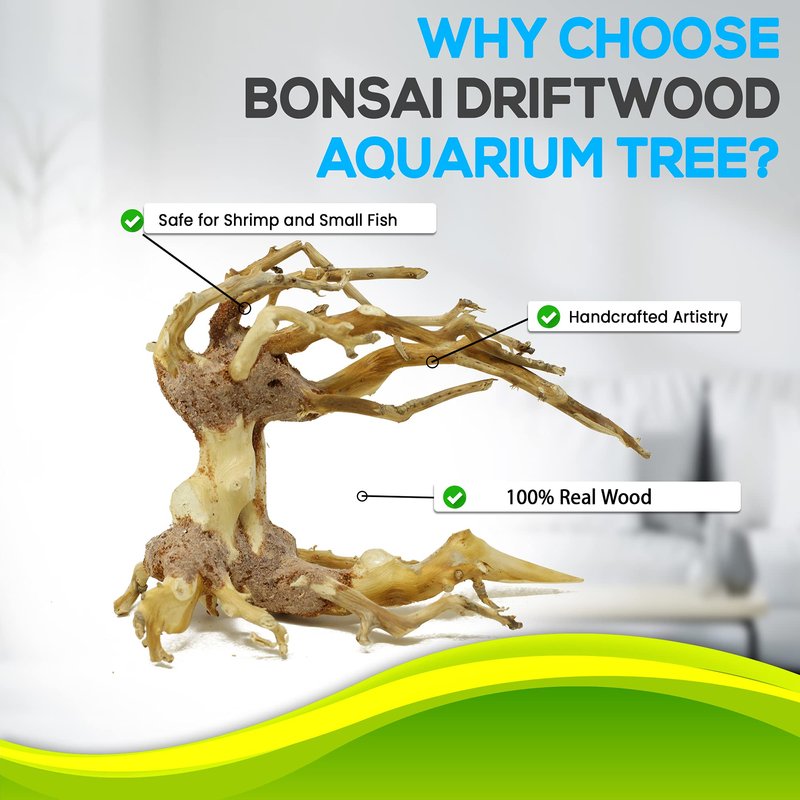 - Natural Fish Tank Decoration – This 4” x 6” bonsai driftwood tree is made from genuine driftwood and crafted into small landscape pieces perfect for organic tank layouts.