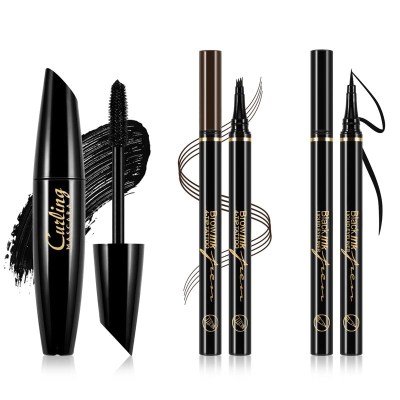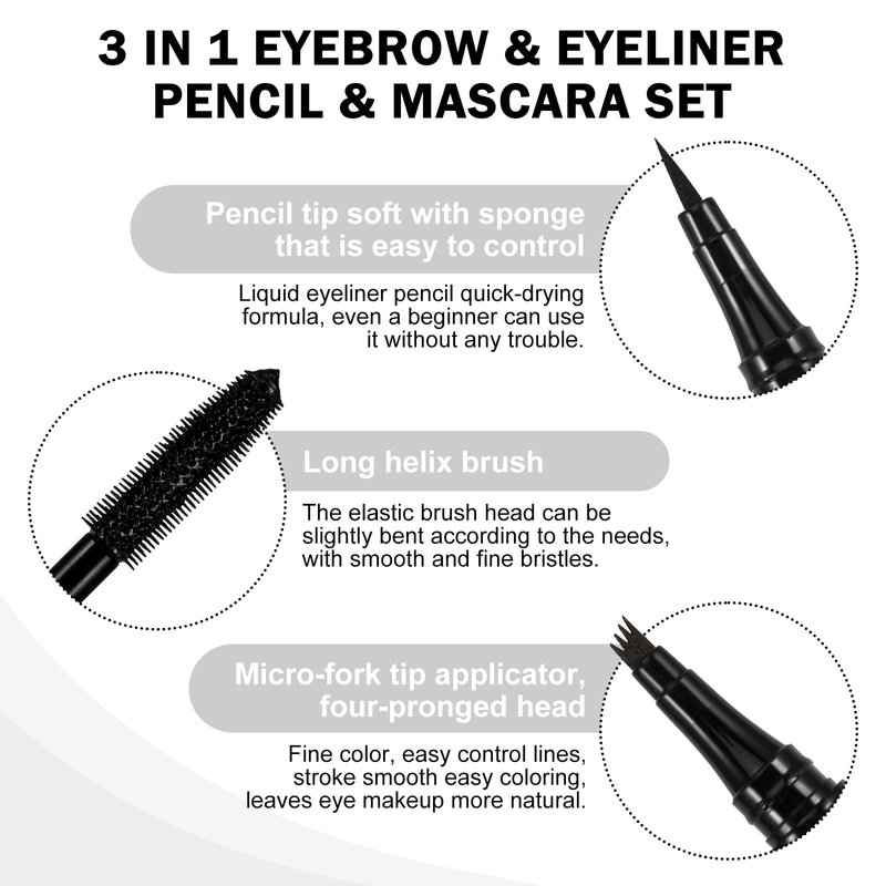 - Eye Makeup 3Pcs Kit: Inside the package it came in was 1 eyebrow pencil, 1 eyeliner and 1 eyelash mascara. They smudge-proof, no flaking lasting, waterproof will keep you away from the embarrassing situation.
