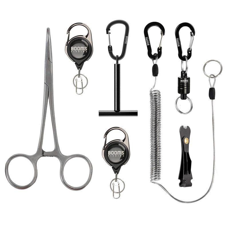 Booms Fishing focus on fishing tools and accessories! We insist on making fishing easy! Booms Fishing FF3 7 PCS fly fishing tools kit includes fishing knot tool and line clipper, zinger retractor, magnetic net release, fishing coiled lanyard, fly fishing tippet spool holder, hook remover forceps. Ideal fly fishing accessories for fishermen.