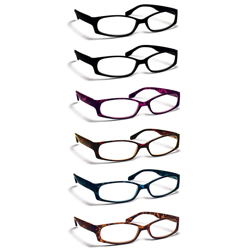 6 pairs of fashion oval-framed reading glasses with the same magnification strength for all 6 pairs. Keep one pair in every room of the house, at work, in your car's glove box, or in your purse, backpack, or carry-all to have handy when and where you need them. Shatter-resistant frames AND lenses for long-lasting wear, clarity, and UV-filtering. Lightweight, stylish, and durable, these glasses provide the vision boost you want. Fashionable frame shape in fun colors and patterns including solid black (2), traditional brown tortoiseshell (1), blue tortoiseshell, red tortoiseshell (1) and purple tortoiseshell (1) to match any mood and any face. Spring-loaded temple hinges for a comfortable fit, easy placement, and removal. No pinching and no added stress on glass temples. SPECIFICATIONS: Total width: 138mm/5.43" Lens width: 54mm/2.13" Lens height: 27mm/1.06" Bridge width: 14mm/0.55" Temple length: 100mm/3.94" (from lens to curvature)