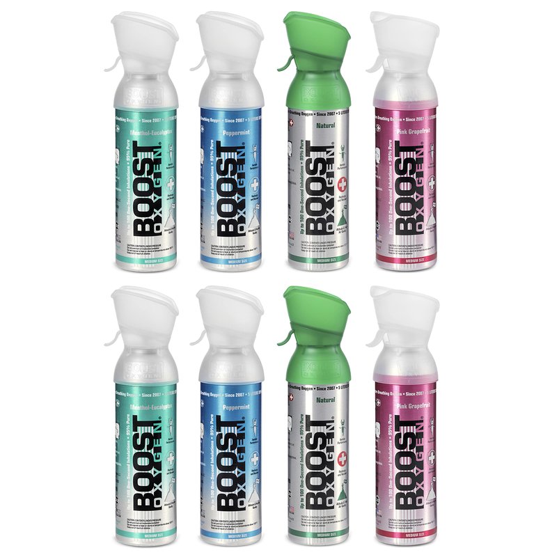 Boost Oxygen 5 Liter Canister for Respiratory Support Includes 2 Natural, 2 Peppermint, 2 Menthol Eucalyptus, and 2 Pink Grapefruit (8 Pack)