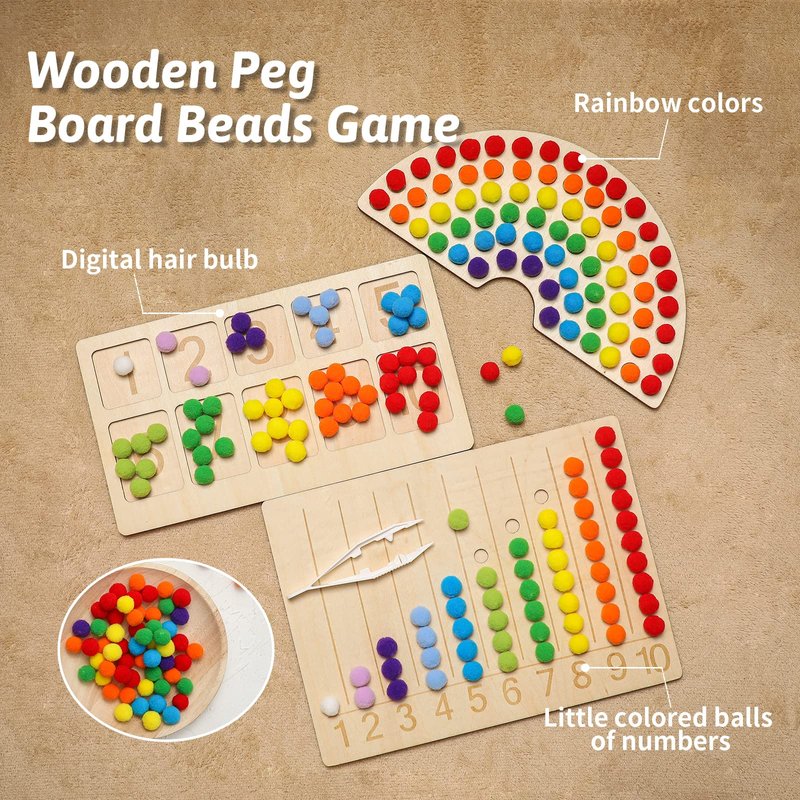 bopoobo Wooden Peg Board Beads Game Rainbow Clip Bead Puzzle of Pompon Clip Beads Early Education Puzzle Board Game Toddler Educational Montessori Games for Math Learning (Digital Board)