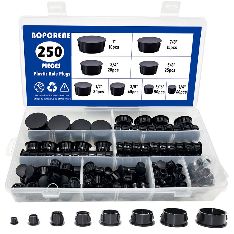- What Will You Get: 250 pcs Plastic Hole Plug Set in 8 common sizes.60pcsx6mm (1/4"), 50pcsx8mm (5/16"), 40pcsx10mm (3/8"), 30pcsx12mm (1/2"), 25pcsx16mm (5/8"), 20pcsx19mm (3/4"), 15pcsx22mm (7/8"),10pcsx25mm (1"); Assorted sizes screw hole plugs are placed in a transparent box with compartments to meet for you various needs.