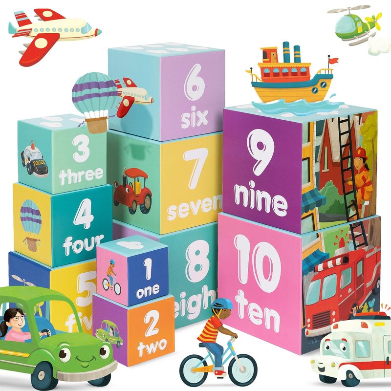 These baby stacking blocks are perfect for toddlers and preschoolers who are just starting to learn about numbers and letters. The blocks are made of high-quality, durable cardboard and are designed to be safe for children to play with. The set includes 10 blocks, each with different numbers, letters and vehicles on them. The blocks are also easy to stack and build, making them a great way for children to develop their fine motor skills and hand-eye coordination. The vehicles theme of the blocks is also fun and engaging for children, and is sure to inspire their imagination and creativity. These blocks are a great gift for any child who is just starting to learn about numbers and letters, and are sure to provide hours of fun and learning.