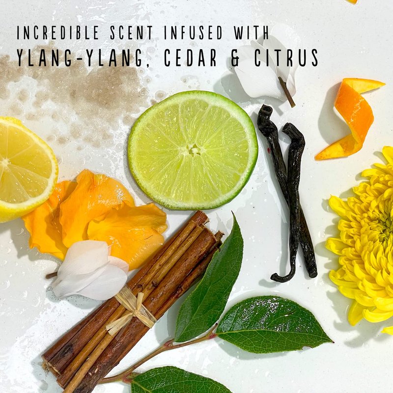 - RELAXING SCENT: Tune out the world and take a vacation without leaving your tub. The relaxing scent of ylang-ylang, cedar and citrus will send your worries out to sea.