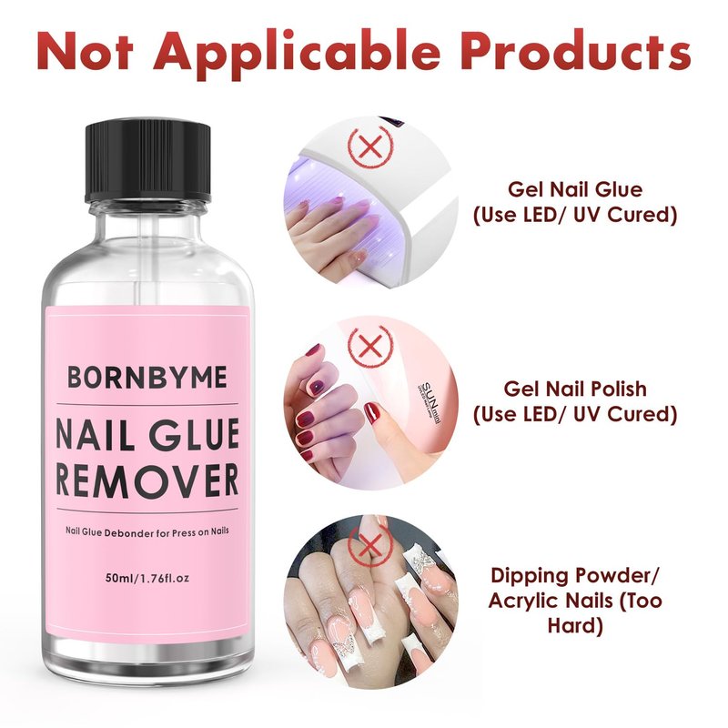 - Warm Tips for BORNBYME Nail Glue Remover :1. The glue remover can't remove gel nail polish, uv nail glue gel or rhinestone glue gel and other UV Nail Gel. 2.Apply glue remover around the cuticle first helps to remove the fake nail or press on nails quickly