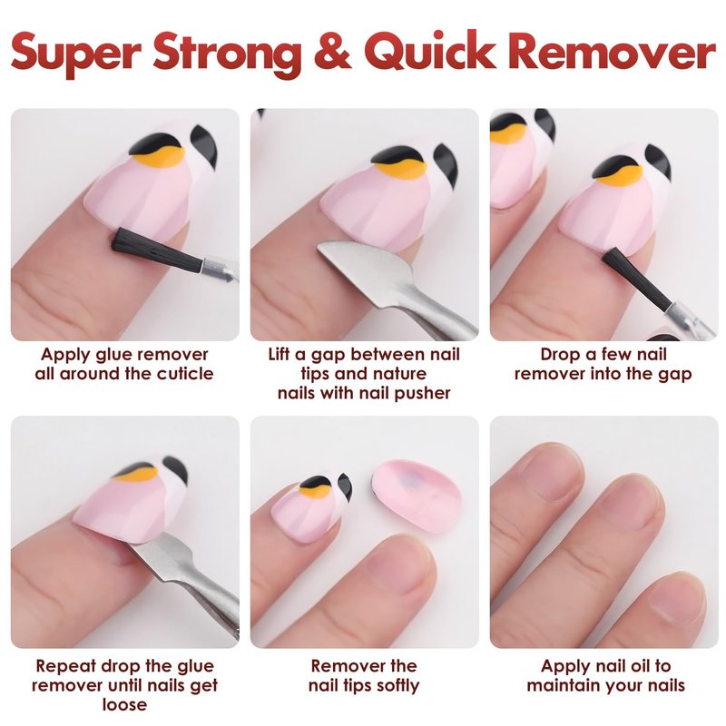 1. Apply nail glue remover around all the edges of the nails 2. Apply glue remover between nails & nail tips 3. Use nail pusher to lift a gap 4. Drop a few remover in the gap 5. Repeat dropping until the nail tips dissolve and get soft 6. Remove the false nails sightly