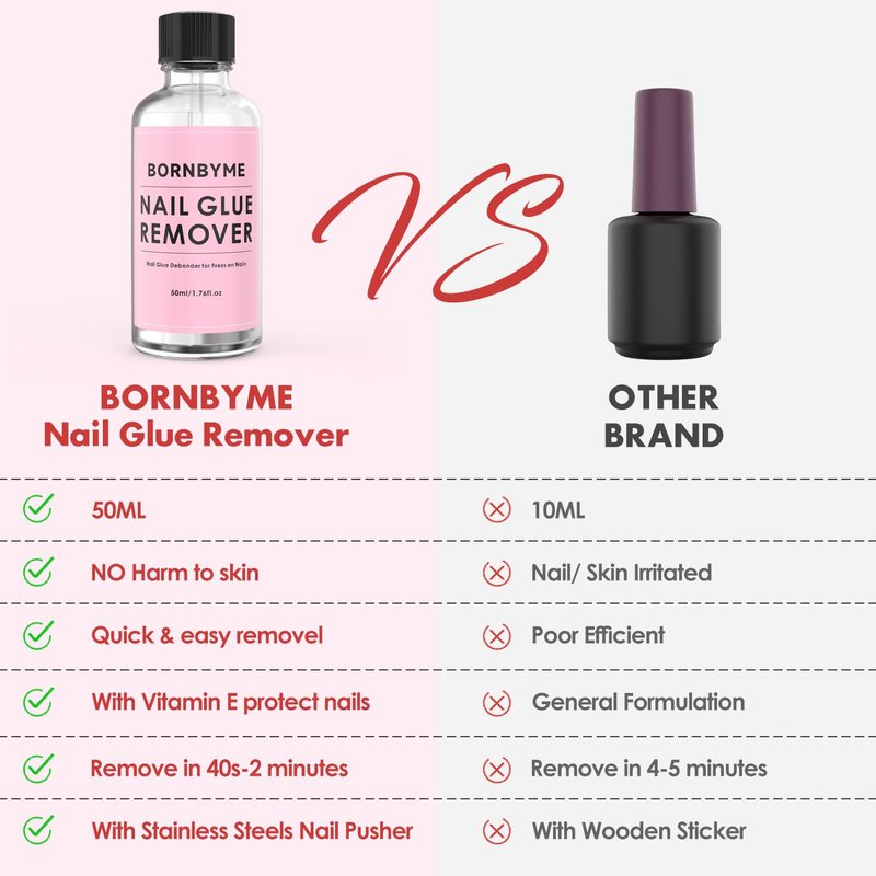 - Easy Apply Quick Remove:BORNBYME 15ML nail glue remover nail debonder with stainless steels nail pusher for you easy & convenient to remove the glue on nails or press on nails 30-45 seconds