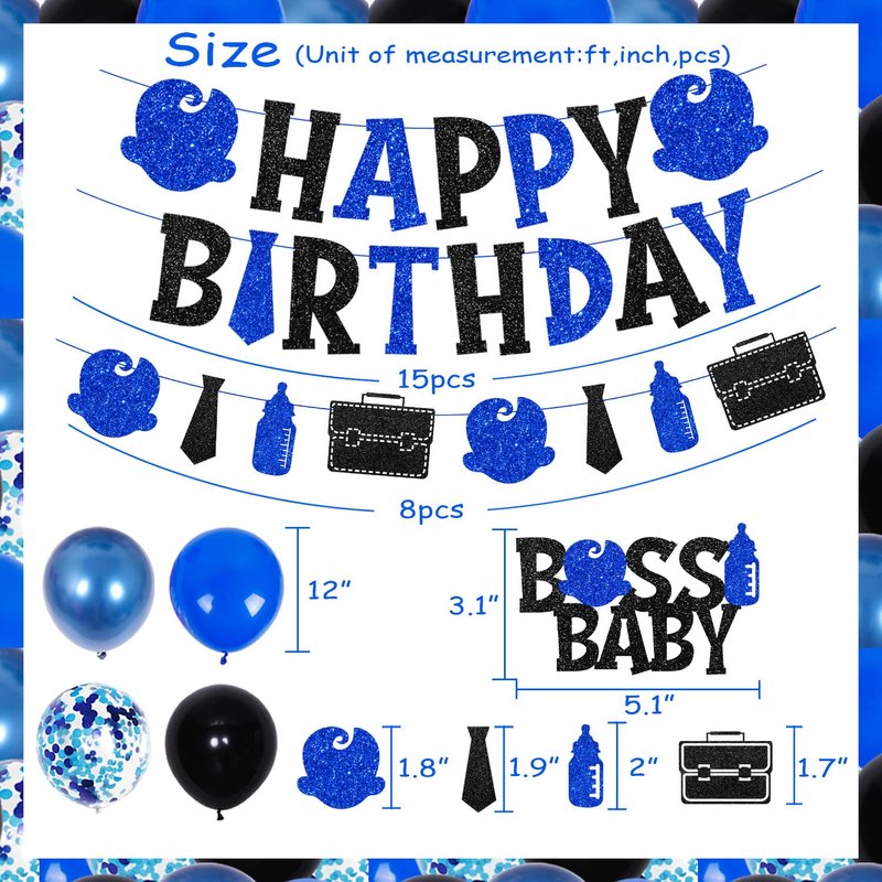 - BOSS 1ST BIRTHDAY SET: This set consists of a total of 61 pieces, including 1*glitter paper HAPPY BIRTHDAY banner, 1*glitter paper BABY BOY BOSS banner, 22*latex balloons(12inch), 12*cake toppers, 1*big cake toppers(3.1*5.1inch) and some assembly tools in the set, and you can start a special boss themed birthday party with your family and friends.