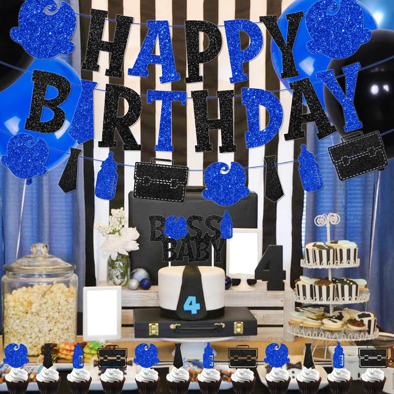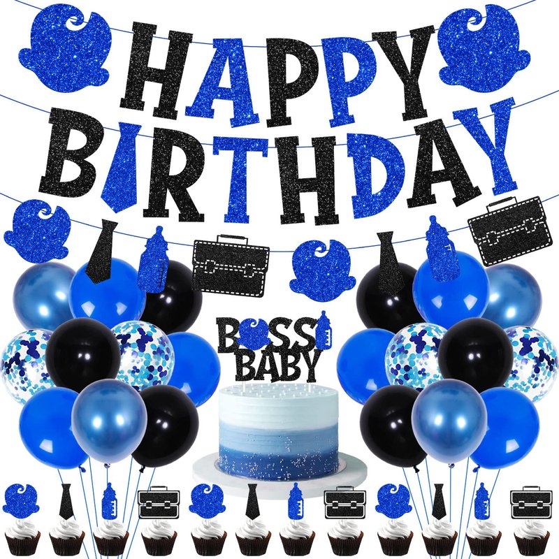 Boss Birthday Party Decorations for Blue Black Boss Boy Baby Themed Happy Birthday Banner Cake Toppers Balloons Set for Newborn Boy Child Kid Bday Party 1st 2nd 3rd Birthday Decor Supplies
