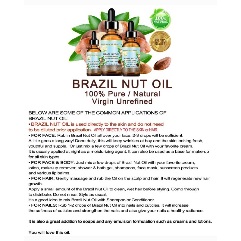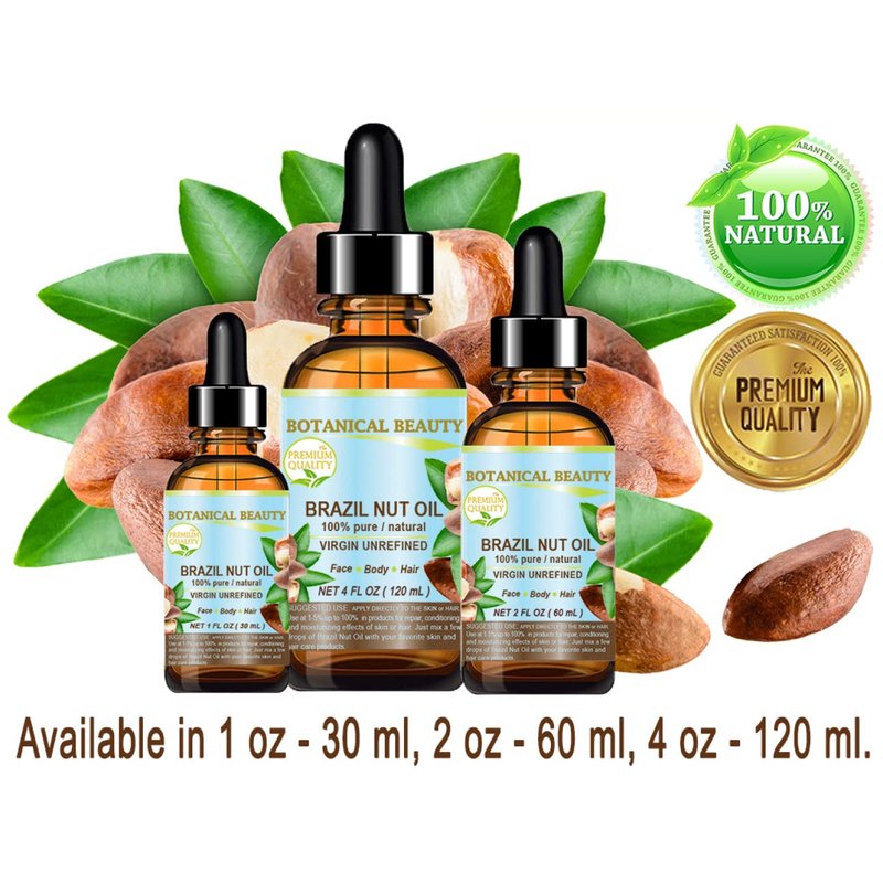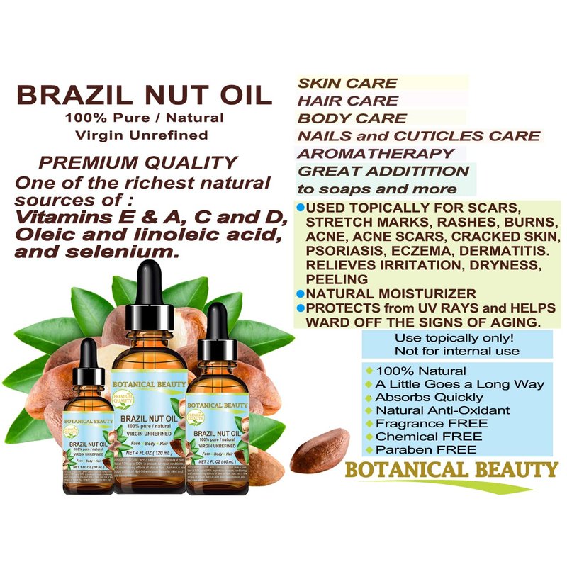- Botanical Beauty BRAZIL NUT OIL Bertholletia Excelsa is 100% PURE WILD GROWTH RAW with no additives for FACE, SKIN, BODY, HAIR, NAILS, FOOT CARE. BRAZIL NUT OIL is high in linoleic, oleic fatty acids and palmitic acids, vitamin E, vitamin A, vitamin C, vitamin B 6, vitamin B 12, vitamin D, omega 3, omega 6 and selenium.