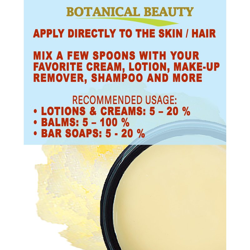 Great additional for soap, creams, lotions, body butter, and more. Recommended lotions, Creams: 5 – 20 %, Balms: 5 – 100 %, Bar Soaps: 5- 20%
