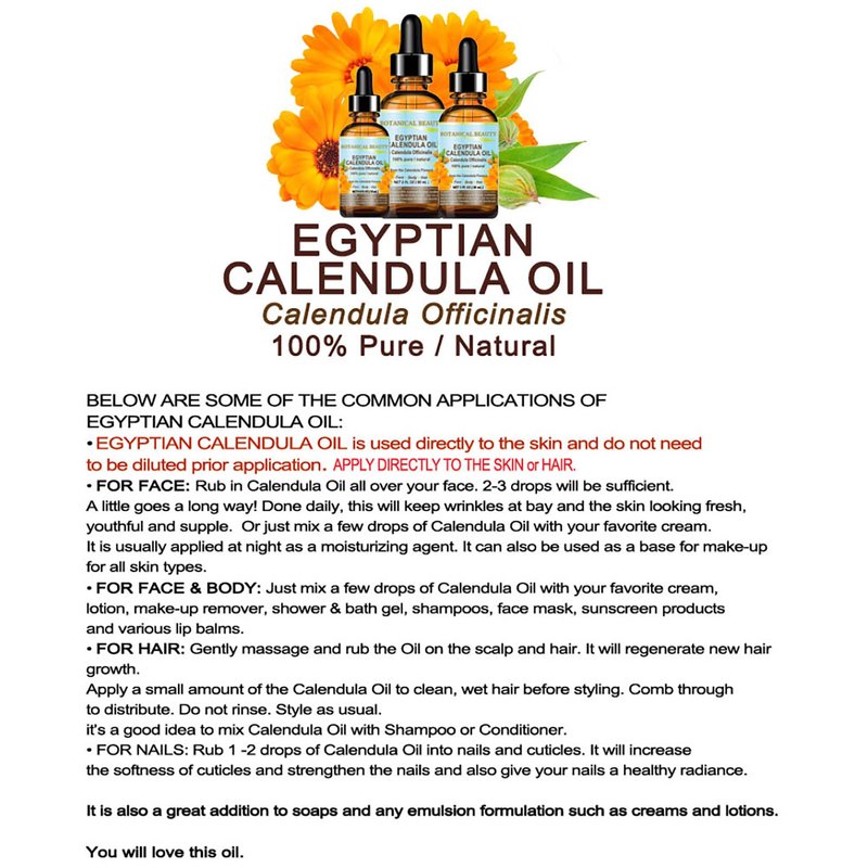 - Botanical Beauty Organic CALENDULA OIL Egyptian Calendula Officinalis is Pure Botanical Natural with no additives. A Little Goes a Long Way, Absorbs Quickly, Not Greasy, Not tested on Animals, Does not contain any preservatives.