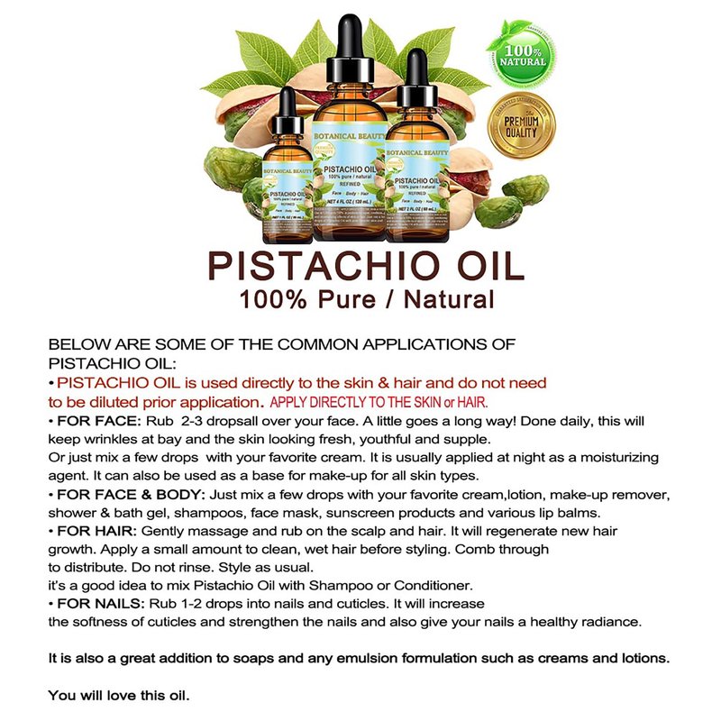 - Botanical Beauty PISTACHIO OIL Pistacia vera is 100% Pure Refined Cold Pressed Carrier Oil with no additives. PISTACHIO NUTS are the richest source of naturally occurring Vitamin E, linoleic, oleic fatty acids and omega 3, omega 6, omega 9. Used for thousands of years for its moisturizing properties. PISTACHIO OIL is one of the best anti aging anti wrinkle face oils.
