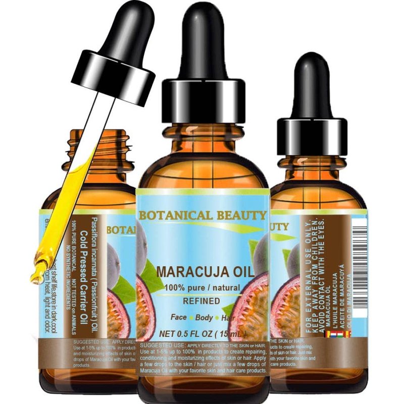 - Botanical Beauty Brazilian MARACUJA OIL (Passionfruit) Virgin Unrefined is rich in gamma linoleic acid, or GLA, which comes from essential fatty acid and vitamin C, vitamin B complex, vitamin E. MARACUJA OIL is PURE UNDILUTED VIRGIN UNREFINED with no additives or artificial fragrances added, does not clog the pores. Absorbs quickly, leaving a light, non-greasy feeling. Not tested on Animals, DOES NOT CONTAIN ANY PRESERVATIVES. It is good oil for face and neck and may even help to reduce wrinkles