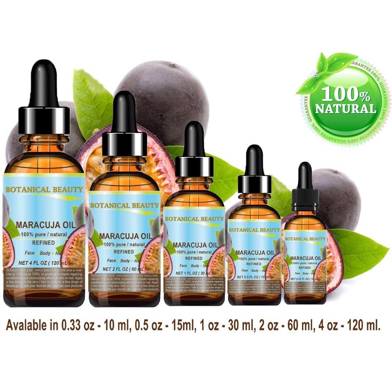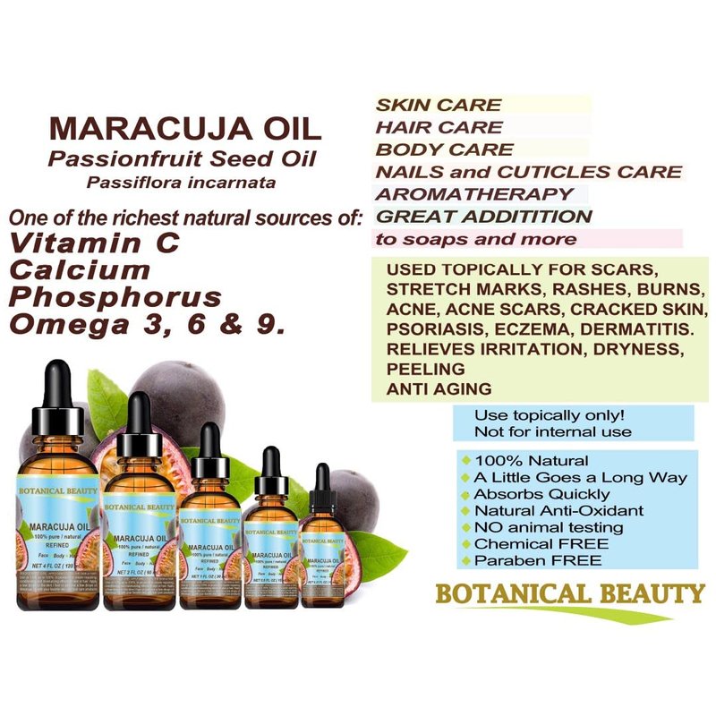 - Botanical Beauty Brazilian MARACUJA OIL (Passionfruit) Virgin Unrefined is rich in gamma linoleic acid, or GLA, which comes from essential fatty acid and vitamin C, vitamin B complex, vitamin E. MARACUJA OIL is PURE UNDILUTED VIRGIN UNREFINED with no additives or artificial fragrances added, does not clog the pores. Absorbs quickly, leaving a light, non-greasy feeling. Not tested on Animals, DOES NOT CONTAIN ANY PRESERVATIVES. It is good oil for face and neck and may even help to reduce wrinkles