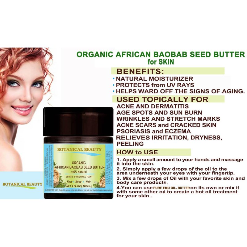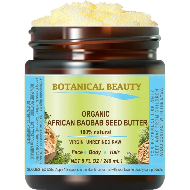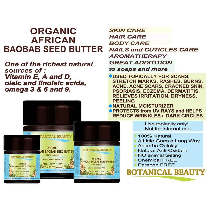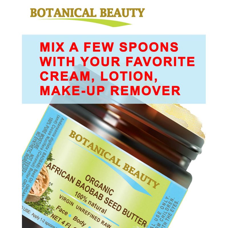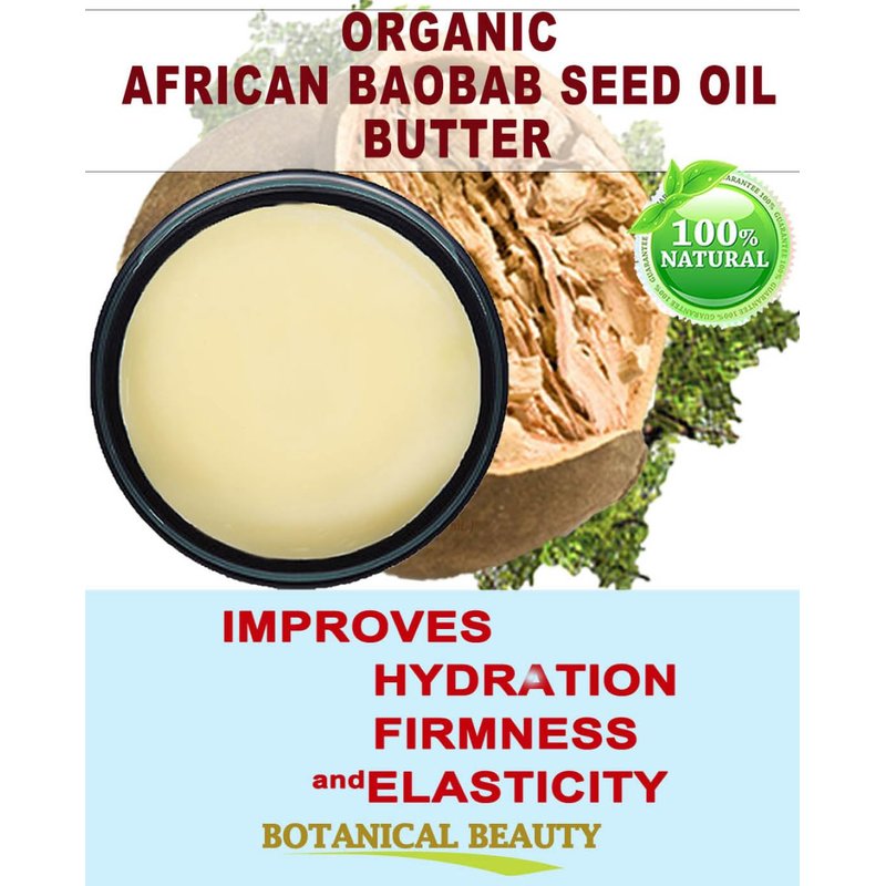 - Botanical Beauty ORGANIC BAOBAB SEED OIL BUTTER RAW is high in linoleic acid and also contains alpha-linolenic acid, oleic acid, phytosterols, phospholipids, vitamin C, vitamin E ( tocotrienols and tocopherols), vitamin A, vitamin F, Vitamin D, omega 3, omega 6 omega 9 essential fatty acids, ideal light moisturizer for everyday use. Nature's Perfect moisturizer. It is an excellent addition to your natural sun protection products. A Little Goes a Long Way, Absorbs Quickly, Not Greasy, Not tested
