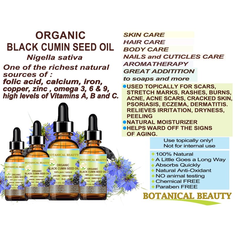 - Botanical Beauty Organic BLACK CUMIN SEED OIL is 100 % PURE, VIRGIN, UNREFINED with fillers, additives or artificial fragrances added, does not clog the pores. Absorbs quickly, leaving a light, non-greasy feeling. Not tested on Animals, DOES NOT CONTAIN ANY PRESERVATIVES. BLACK CUMIN SEED OIL is acquired from the first cold pressed of Organic Black Seeds.