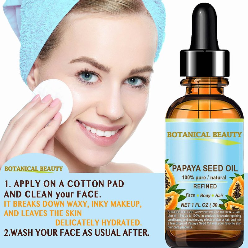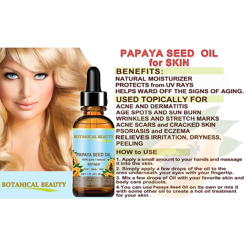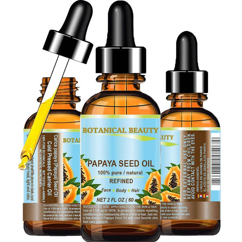 - Botanical Beauty PAPAYA SEED OIL Carica papaya is 100% PURE REFINED RAW with no additives. Significantly higher in Vitamin C. The oil is a good source of papain- natural fruit enzymes and including omega-6 and omega-9 fatty acids. A Little Goes a Long Way, Absorbs Quickly, Not Greasy, Chemical Free, Not tested on Animals, Does not contain any preservatives.