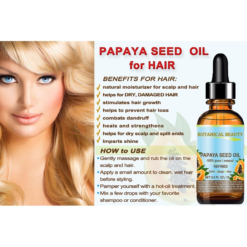 - Use topically for DRY HAIR, DAMAGED HAIR and DRY SCALP, DANDRUFF. It repairs split ends and broken strands, tames frizzy hair, smoothes the surface, and strengthens and softens hair. PAPAYA SEED OIL promotes silky soft hair, prevents moisture loss and adds elasticity and suppleness, and also provides an immediate sparkle and shine, and helps to mend split ends.