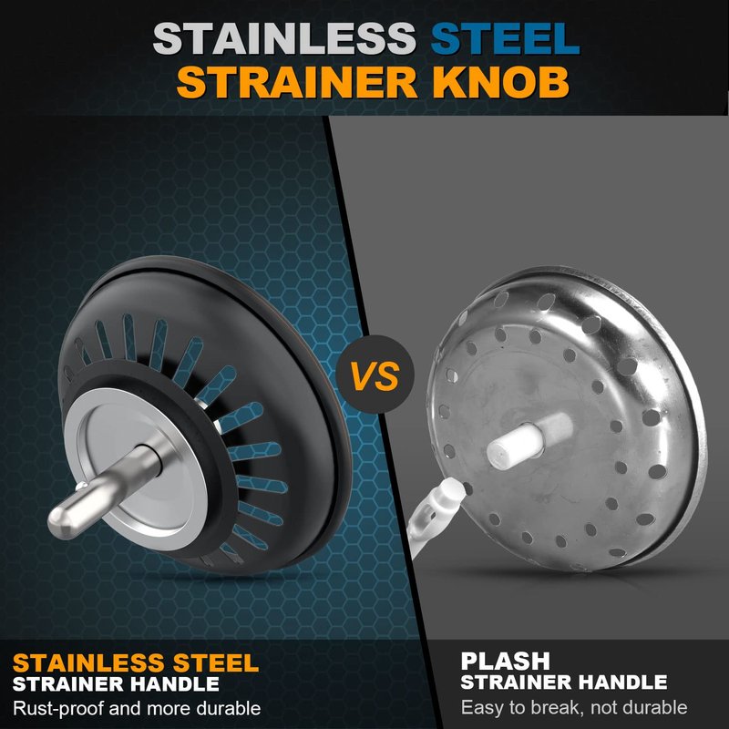 - STRAINER INCLUDED: Built-in removable strainer basket will catch any debris before they clog up plumbing! The strainer also works as a water stopper and drain plug. Simply push down to stop water from draining and pull up to allow water to drain again